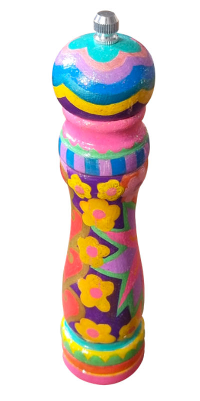 Decorative colourful wooden pepper grinder with floral and rainbow patterns.